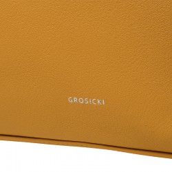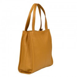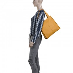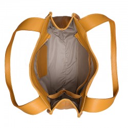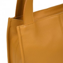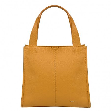 Torebka Kleo wykonana z groszkowanej skóry w kolorze żółtym. Posiada dwie rączki do noszenia w ręku lub na ramieniu. Wewnątrz jedna duża komora, przegroda w formie kieszonki oraz kieszonka na boku torebki. Obie zapinane na ekspres. Cała torebka zapinana zamkiem błyskawicznym. Torebka mieści format A4. Wszystkie elementy metalowe w kolorze srebrnym.