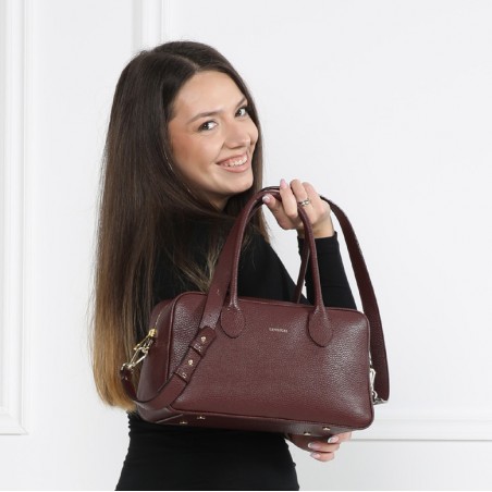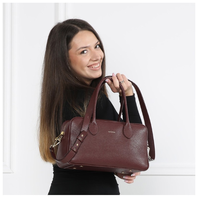 Kalina posiada funkcjonalne wnętrze, pojemna komora w roli głównej z dwiema zapinanymi kieszonkami. Spód torebki zabezpieczony został metalowymi nóżkami, które odpowiednio zabezpieczają ją od spodu. Skóra z subtelnym tłoczeniem wprowadza do modelu nutkę nonszalancji, całość urzeka natomiast precyzją wykonania.